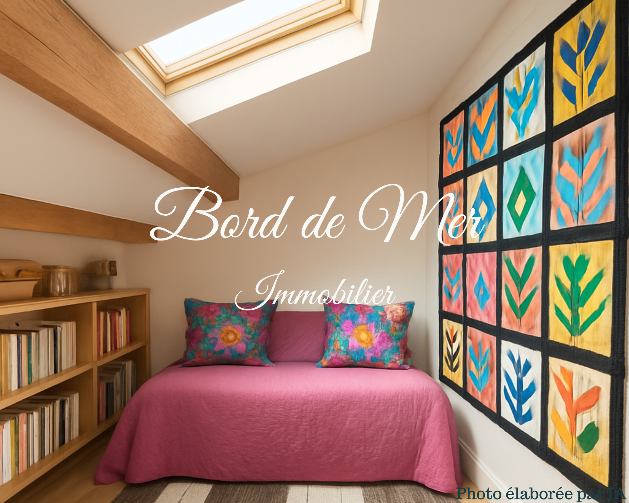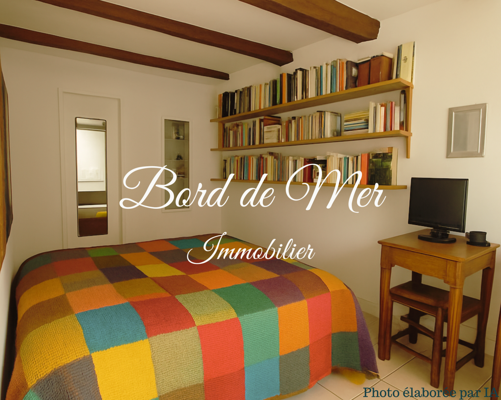 À l’étage, deux chambres lumineuses aux vues dégagées — l’une côté mer, l’autre côté étang — ainsi qu’une salle d’eau avec WC.