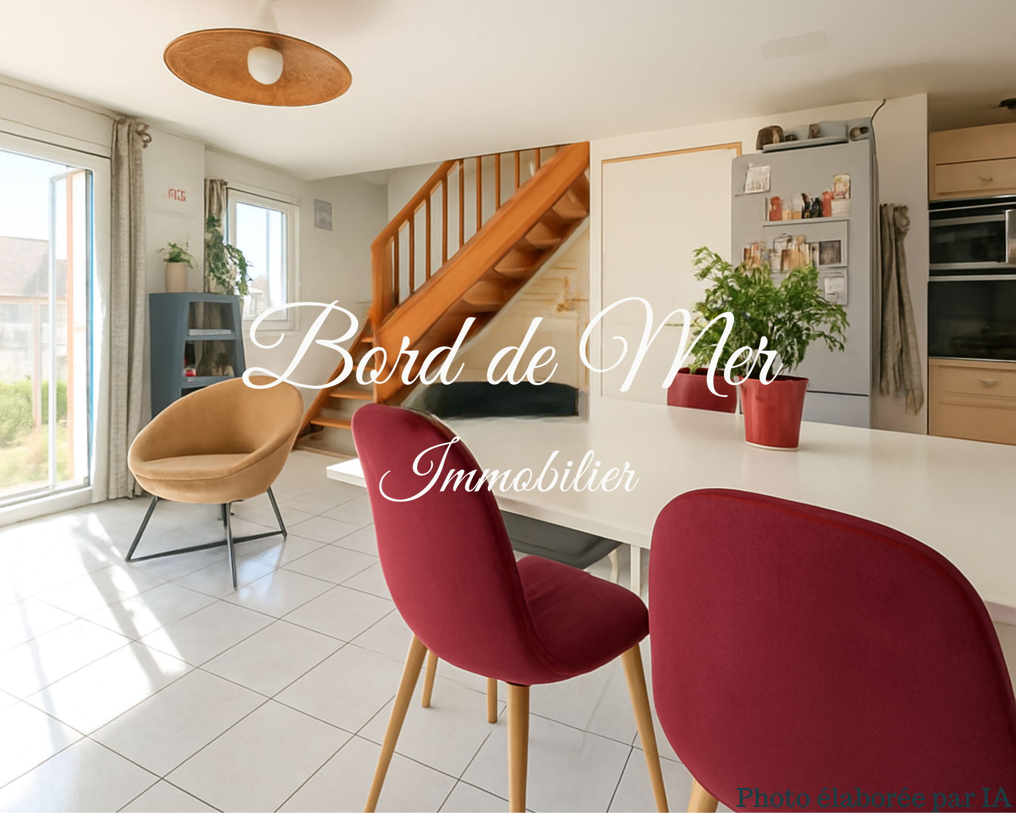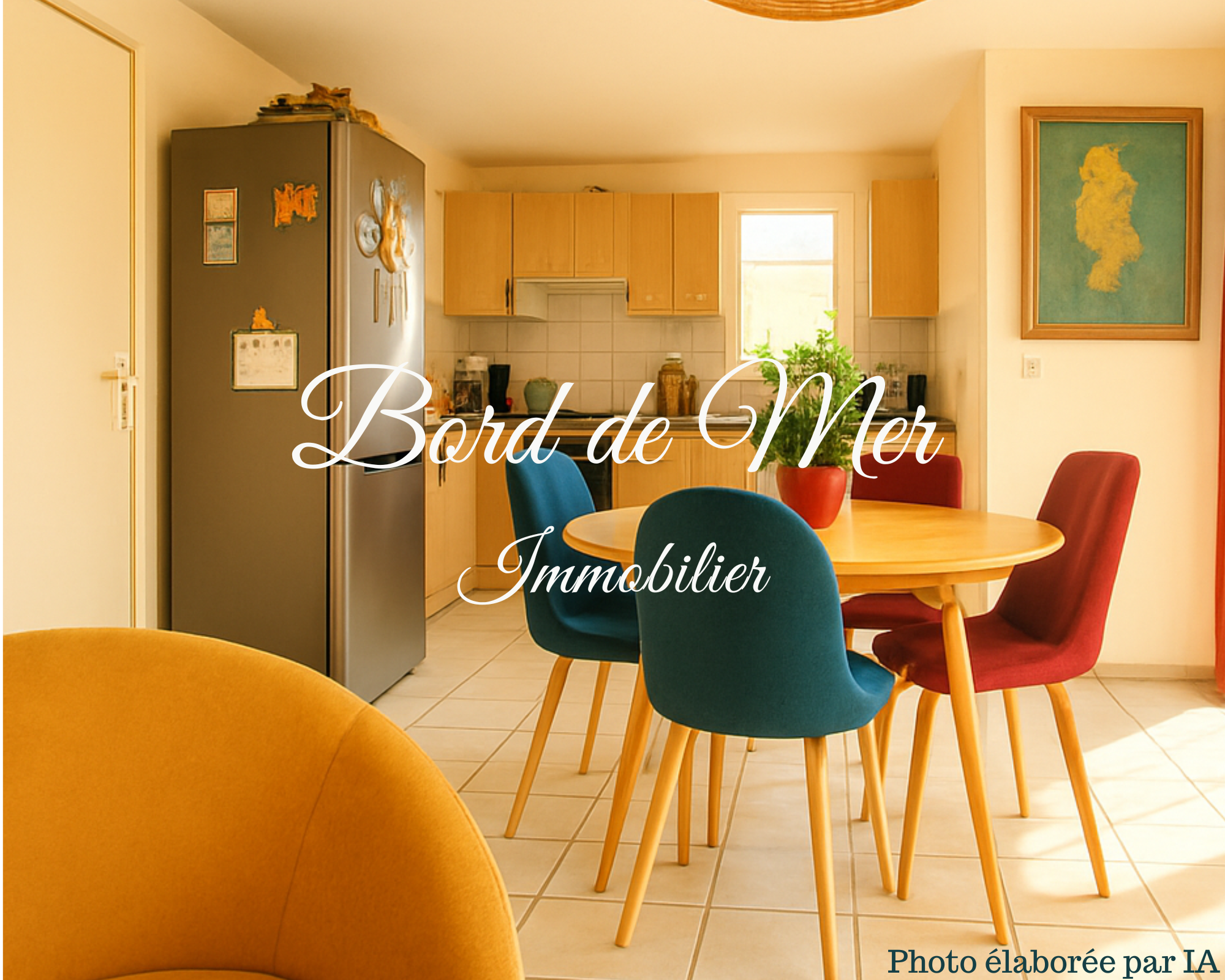 Pièce de vie lumineuse avec cuisine ouverte équipée